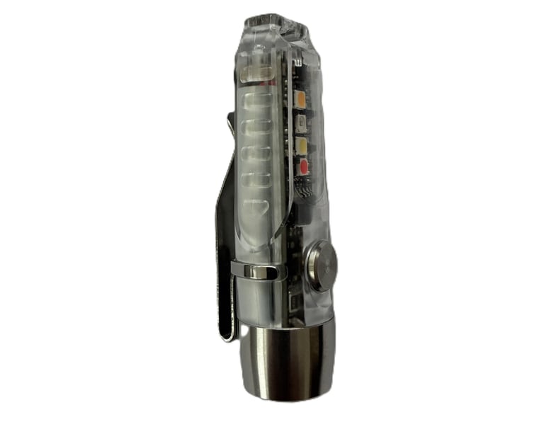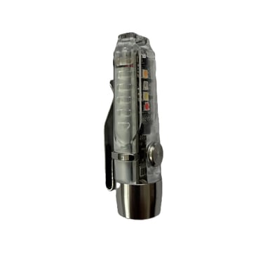 The S12 Pro is a pocket-sized flashlight with a side light panel. It features a stainless steel clip and is available in white (which is actually transparent), fluorescent white, and black.